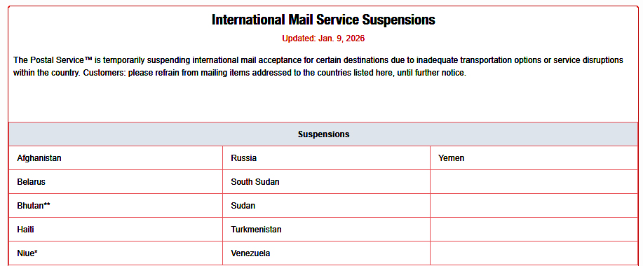 CURRENT LIST HERE: https://about.usps.com/newsroom/service-alerts/international/welcome.htm